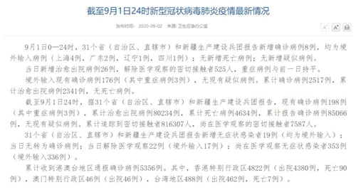 截至9月1日24時(shí),據(jù)31個(gè)省(自治區(qū)、直轄市)和新疆生產(chǎn)建設(shè)兵團(tuán)報(bào)告,現(xiàn)有確診病例198例(其中重癥病例3例),累計(jì)治愈出院病例80234例,累計(jì)死亡病例4634例,累計(jì)報(bào)告確診病例85066例,無(wú)現(xiàn)有疑似病例。累計(jì)追蹤到密切接觸者816307人,尚在醫(yī)學(xué)觀察的密切接觸者7587人。