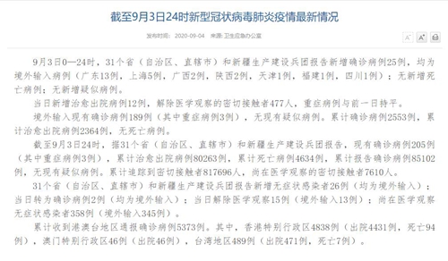 情況顯示,截至9月3日24時,據(jù)31個?。ㄗ灾螀^(qū)、直轄市)和新疆生產(chǎn)建設(shè)兵團報告,現(xiàn)有確診病例205例(其中重癥病例3例),累計治愈出院病例80263例,累計死亡病例4634例,累計報告確診病例85102例,無現(xiàn)有疑似病例。累計追蹤到密切接觸者817696人,尚在醫(yī)學觀察的密切接觸者7610人。