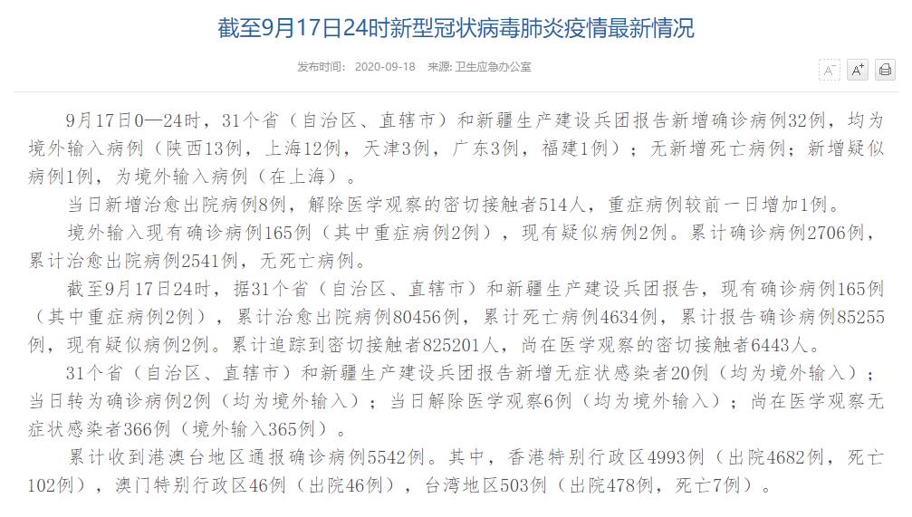 人民網(wǎng)北京9月18日電(董童)國家衛(wèi)生健康委于今日在官網(wǎng)發(fā)布的《截至9月17日24時新型冠狀病毒肺炎疫情最新情況》(以下簡稱“情況”)提出,9月17日0—24時,31個?。ㄗ灾螀^(qū)、直轄市)和新疆生產(chǎn)建設兵團報告新增確診病例32例,均為境外輸入病例(陜西13例,上海12例,天津3例,廣東3例,福建1例);無新增死亡病例;新增疑似病例1例,為境外輸入病例(在上海)。當日新增治愈出院病例8例,解除醫(yī)學觀察的密切接觸者514人,重癥病例較前一日增加1例。