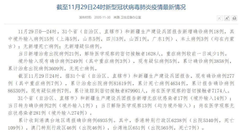 人民網(wǎng)北京11月30日電(董童)國家衛(wèi)生健康委于今日在官網(wǎng)發(fā)布的《截至11月29日24時新型冠狀病毒肺炎疫情最新情況》(以下簡稱“情況”)指出,11月29日0—24時,31個?。ㄗ灾螀^(qū)、直轄市)和新疆生產(chǎn)建設(shè)兵團(tuán)報告新增確診病例18例,其中境外輸入病例15例(上海5例,山東5例,四川3例,山西1例,廣東1例),本土病例3例(均在內(nèi)蒙古);無新增死亡病例;無新增疑似病例。當(dāng)日新增治愈出院病例21例,解除醫(yī)學(xué)觀察的密切接觸者1628人,重癥病例較前一日減少1例。