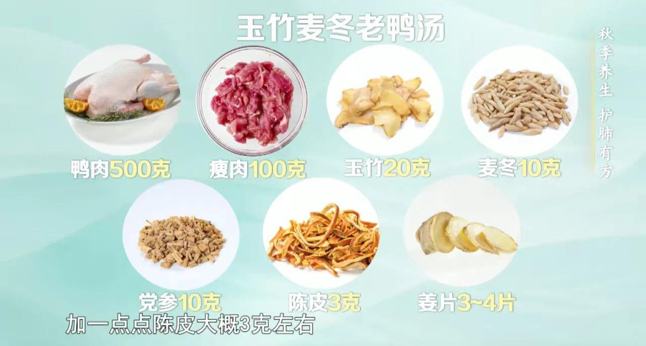做法:將鴨肉和瘦肉洗凈,切成小塊焯水;玉竹和麥冬用水泡10分鐘;將所有材料放入鍋中煮沸,煮約40分鐘至1小時。