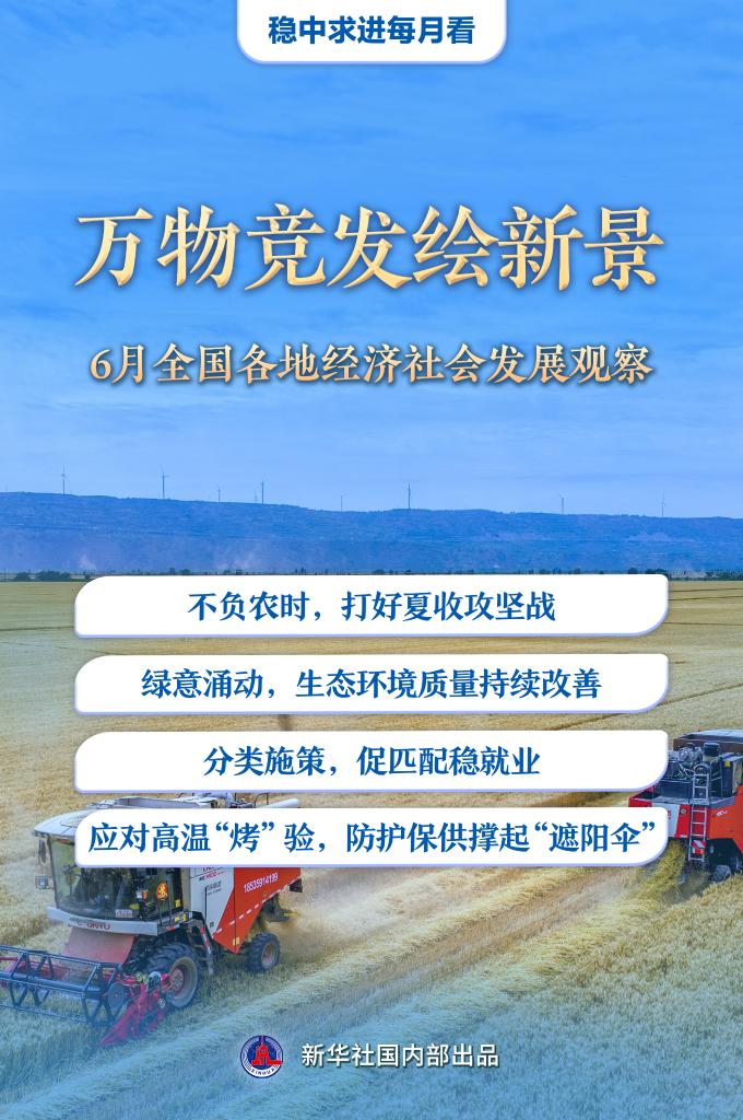6月仲夏,萬物豐茂。廣袤農(nóng)田上,“三夏”生產(chǎn)進(jìn)入關(guān)鍵階段;綠水青山間,低碳發(fā)展不斷繪就新圖景;全力穩(wěn)就業(yè),政府、企業(yè)與高校同頻共振;高溫“烤”驗下,做好各項保障工作……上半年收官之月,各地各部門統(tǒng)籌推進(jìn)穩(wěn)增長、促改革、惠民生舉措,推動經(jīng)濟(jì)社會沿著高質(zhì)量發(fā)展之路穩(wěn)步前行。