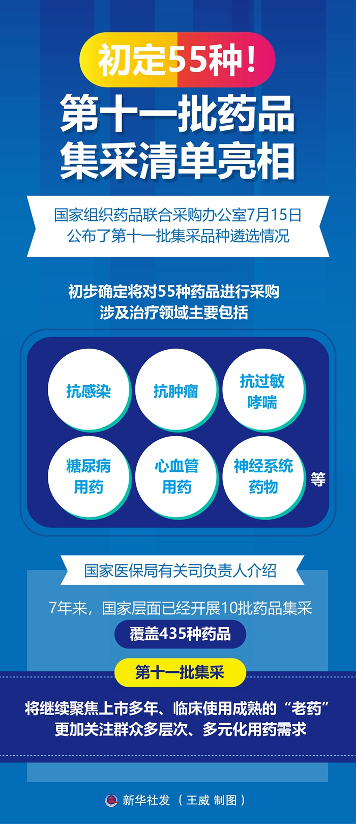 “新藥不集采、集采非新藥?!眹裔t(yī)保局有關(guān)司負(fù)責(zé)人介紹,7年來,國家層面已經(jīng)開展10批藥品集采,覆蓋435種藥品,第十一批集采將繼續(xù)聚焦上市多年、臨床使用成熟的“老藥”,更加關(guān)注群眾多層次、多元化用藥需求。
