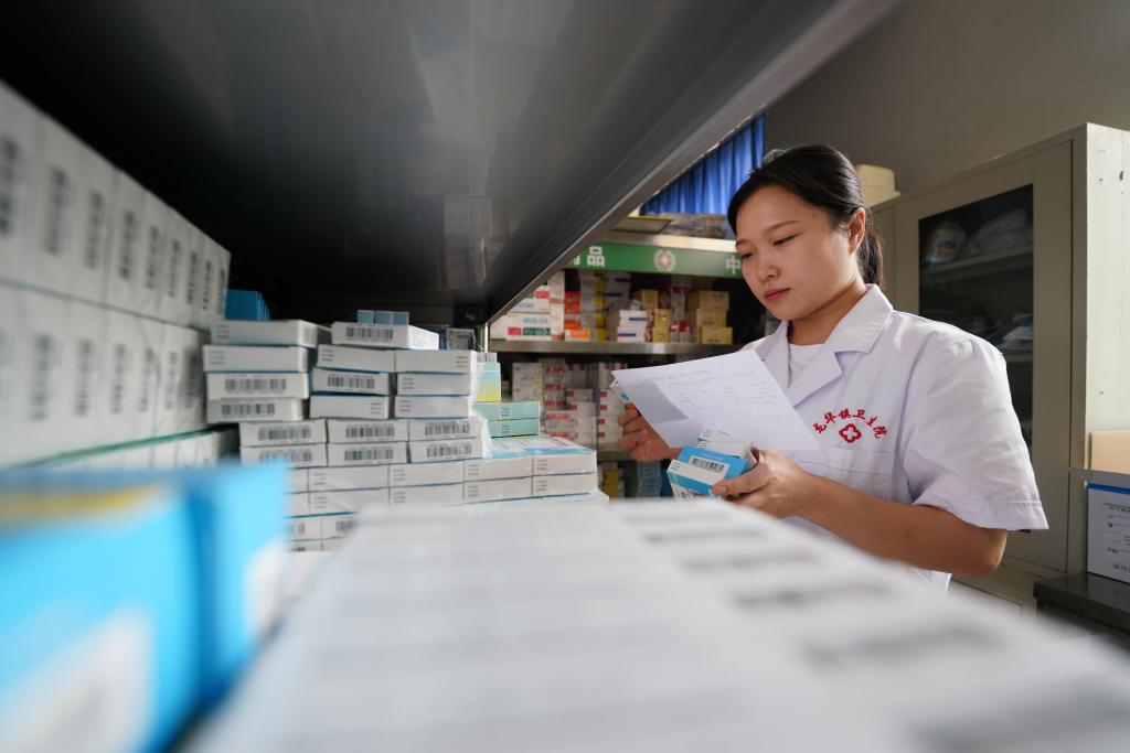 河北省柏鄉(xiāng)縣龍華鎮(zhèn)衛(wèi)生院藥房工作人員在為患者取藥。新華社記者 牟宇 攝