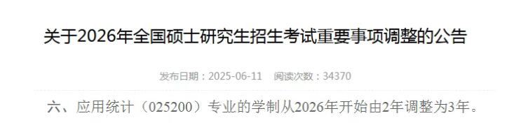 6月11日,中央民族大學(xué)發(fā)布《關(guān)于2026年全國(guó)碩士研究生招生考試重要事項(xiàng)調(diào)整的公告》,明確規(guī)定:應(yīng)用統(tǒng)計(jì)(025200)專業(yè)的學(xué)制從2026年開始由2年調(diào)整為3年。