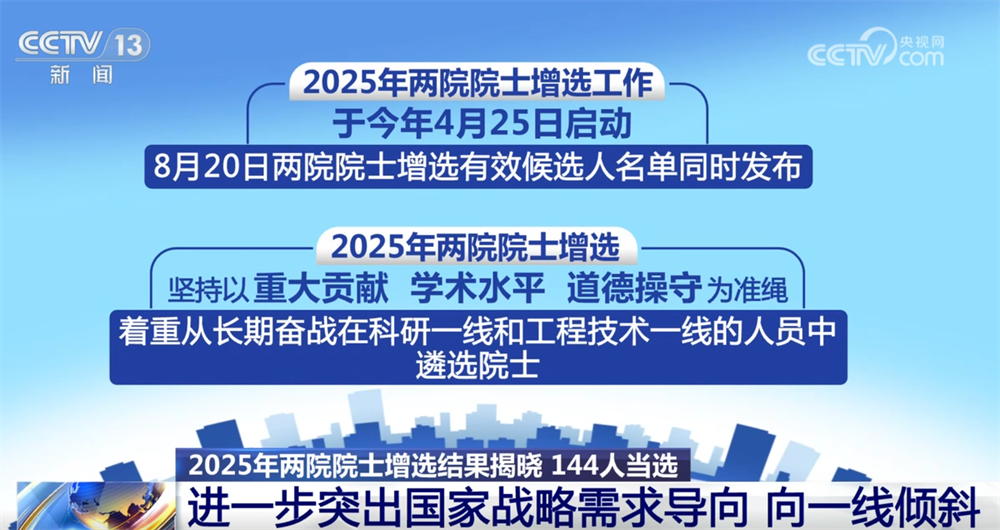 央視網(wǎng)消息:11月21日,2025年兩院院士增選結(jié)果正式揭曉,共有144人當(dāng)選,院士隊伍的年齡結(jié)構(gòu)、學(xué)科、地區(qū)和行業(yè)布局進(jìn)一步優(yōu)化。