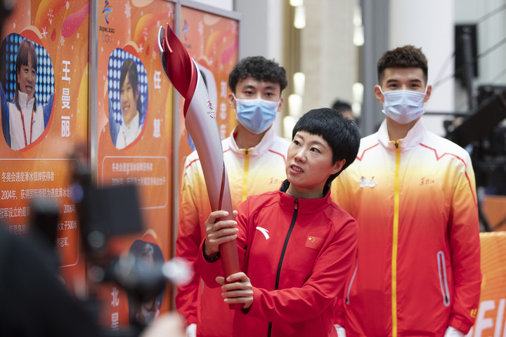 1月5日,北京冬奧會火炬開始在黑龍江省進行展示,冬奧會短道速滑冠軍張會(中)在活動現(xiàn)場手持火炬。新華社記者 張濤 攝