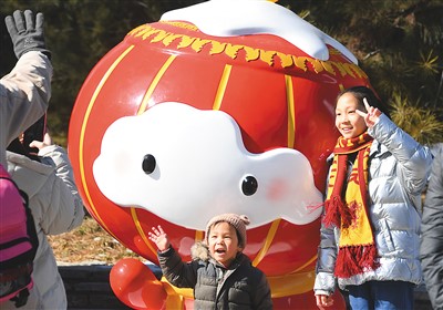 2月20日,在北京市海淀區(qū)冬奧文化廣場(chǎng),小朋友與“雪容融”合影留念。新華社記者 任 超攝