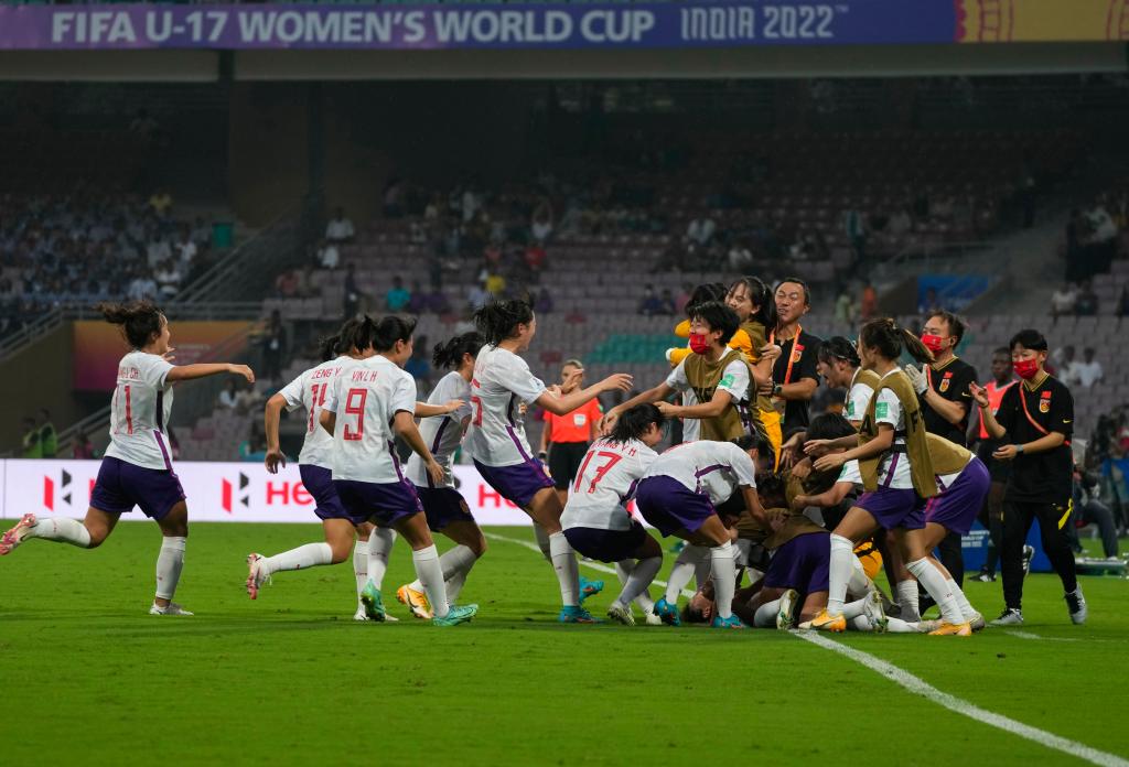 10月12日,中國(guó)隊(duì)球員喬睿琪(右三)在比賽中主罰點(diǎn)球命中后慶祝。新華社/美聯(lián)