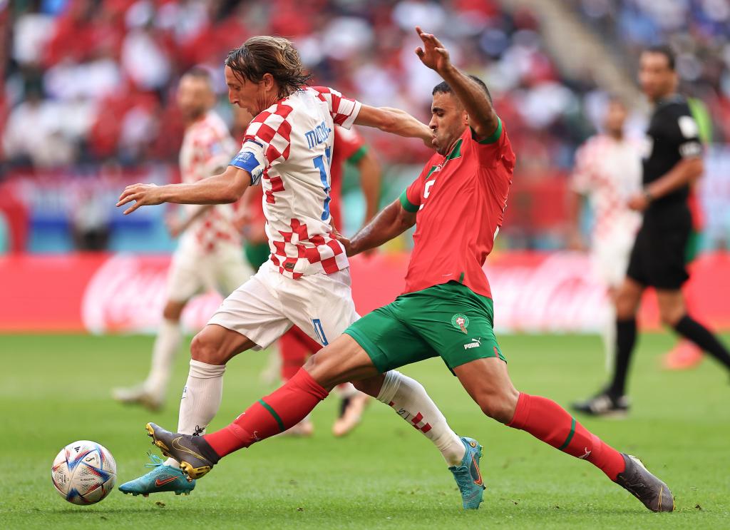 11月23日,克羅地亞隊(duì)球員莫德里奇(左)與摩洛哥隊(duì)球員阿格德拼搶。新華社記者丁旭攝