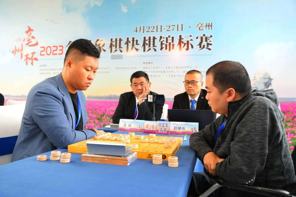 快棋組決賽采用“兩局分先制”,在亳州市華佗百草園景區(qū)進(jìn)行。男子組冠軍爭(zhēng)奪戰(zhàn)第一局由趙攀偉執(zhí)先手,雙方以和棋收?qǐng)?。第二局換先再戰(zhàn),孟辰執(zhí)先手?jǐn)[出“中炮直橫車進(jìn)三兵”開局,趙攀偉應(yīng)以“屏風(fēng)馬進(jìn)三卒”。雙方布局階段便產(chǎn)生激斗,最終孟辰通過步步精準(zhǔn)的進(jìn)攻取得勝利。