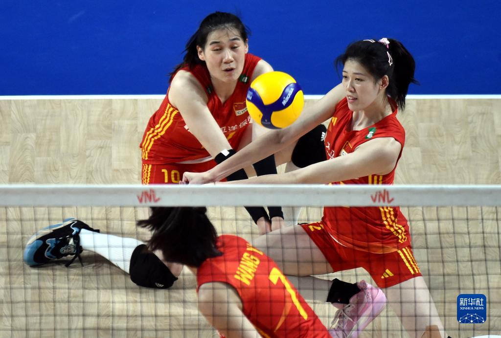 6月13日,中國隊(duì)球員袁心玥(上)在比賽中扣球。新華社記者盧炳輝攝