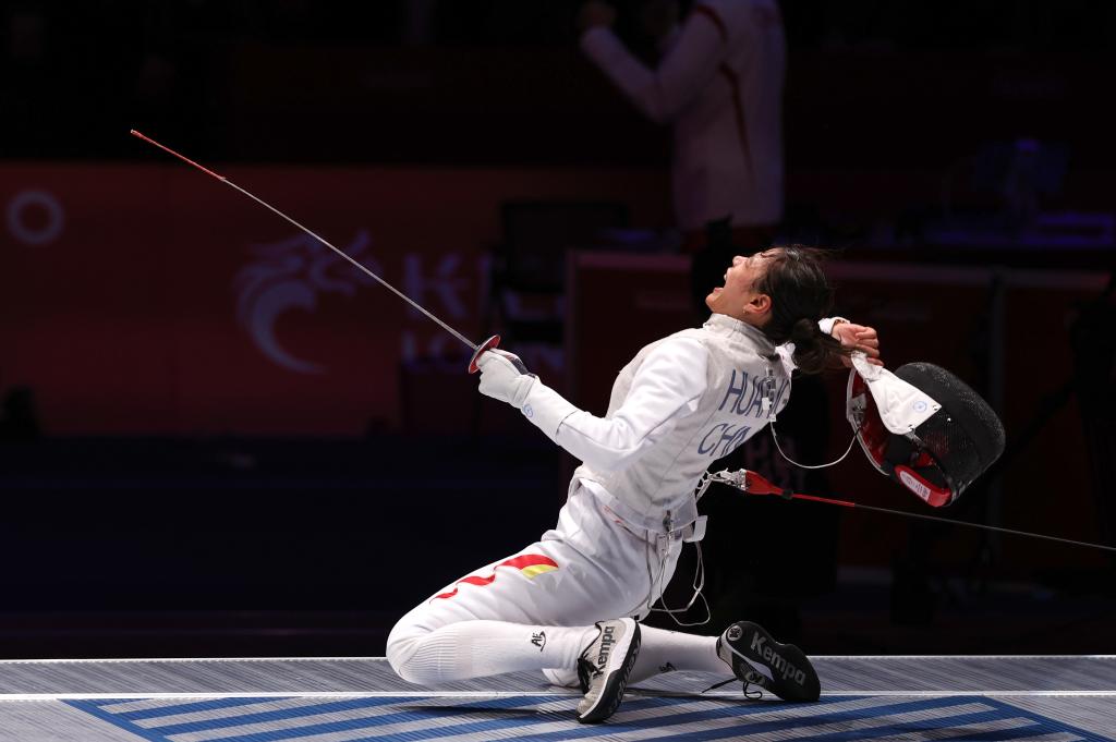25日,杭州亞運(yùn)會女花個人決賽中,隨著黃芊芊刺中制勝一劍,顯示器上的比分定格在15:8。這位21歲的中國女花新星,為中國擊劍隊斬獲本屆亞運(yùn)會首金。