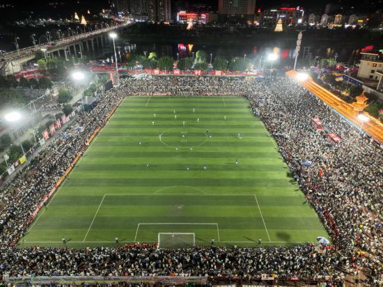 這是7月29日拍攝的夜幕下的“村超”總決賽現(xiàn)場(無人機照片)。新華社記者 歐東衢 攝