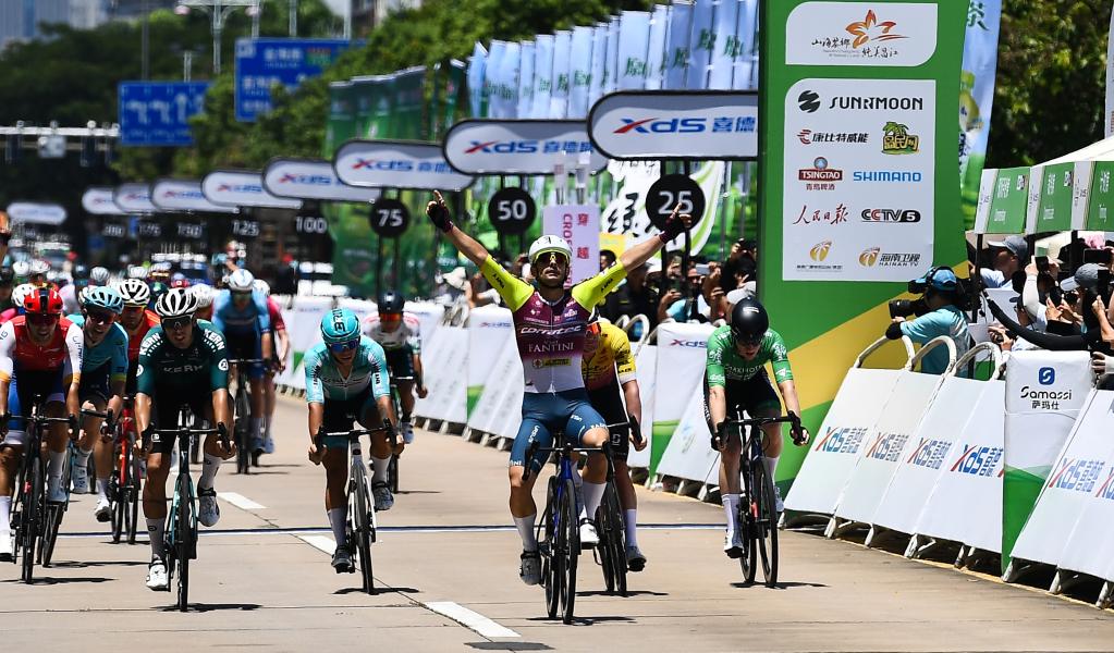 8月27日,意大利克羅蒂克車隊(duì)車手馬雷奇科(前)率先沖線后慶祝。新華社記者 楊冠宇 攝 作為當(dāng)日的沖刺王,這名意大利車手還贏得了綠衫。西班牙科恩制藥車隊(duì)的安吉爾和飛銳快客洲際車隊(duì)的馬丁分列賽段二、三位。 環(huán)島賽第一賽段設(shè)在瓊海,車手上午10點(diǎn)從市政廣場(chǎng)出發(fā),途經(jīng)博鰲亞洲論壇永久會(huì)址、潭門漁業(yè)小鎮(zhèn)、南海博物館等知名地標(biāo),全程95.6公里。 中國(guó)車手在本賽段表現(xiàn)不俗。巴迪瑞洲際車隊(duì)的王奎程摘得象征亞洲最佳車手的藍(lán)衫,五指山1867車隊(duì)的薛超華以爬山王身份穿上圓點(diǎn)衫,同隊(duì)的于澤獲得“敢斗獎(jiǎng)”。