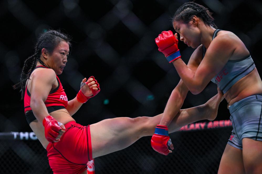 11月23日,石銘(左)在比賽中。當(dāng)日,在2024年UFC格斗之夜澳門站精英之路女子草量級(jí)決賽中,石銘戰(zhàn)勝馮蕭燦。新華社記者 張金加 攝