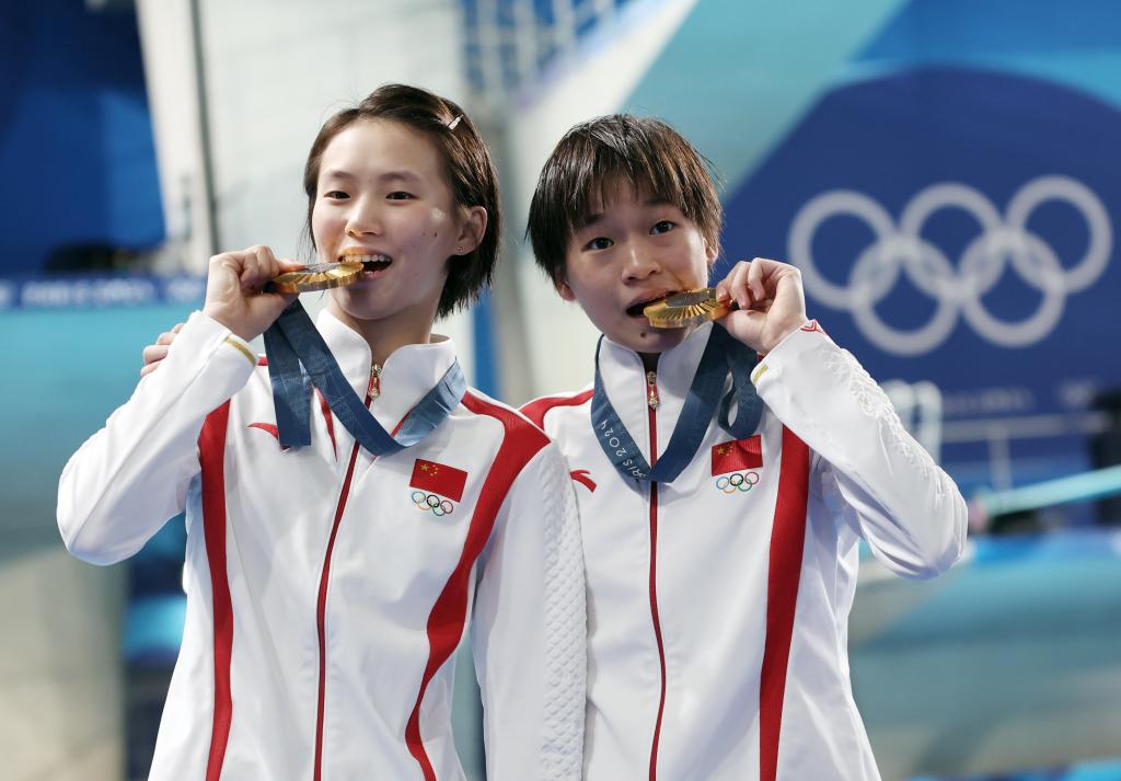 7月31日,冠軍中國(guó)選手陳芋汐(左)/全紅嬋在頒獎(jiǎng)儀式上。當(dāng)日,在巴黎奧運(yùn)會(huì)跳水女子雙人十米臺(tái)決賽中,陳芋汐/全紅嬋奪得金牌。新華社記者 張玉薇 攝