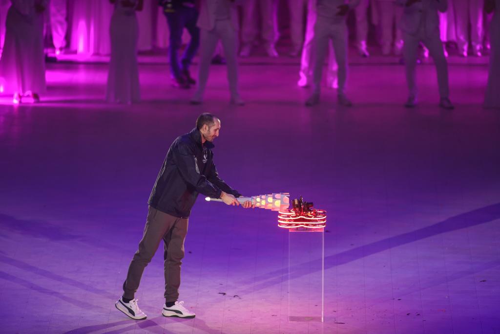 意大利體育和青年部長安德烈亞·阿博迪出席開幕式并宣布運(yùn)動(dòng)會(huì)開幕。在充滿風(fēng)情的歌舞、魔術(shù)和雜技表演后,意大利足球名宿基耶利尼手持火炬,將一臺(tái)無人機(jī)“激活”。隨后,發(fā)光的無人機(jī)從奧林匹克體育館飛向都靈王宮,將矗立在王宮前的主火炬點(diǎn)亮。