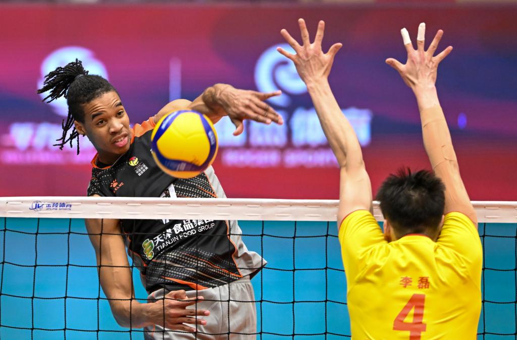3月6日,天津男排球員亞歷杭德羅(左)在比賽中扣球。新華社記者 孫凡越 攝