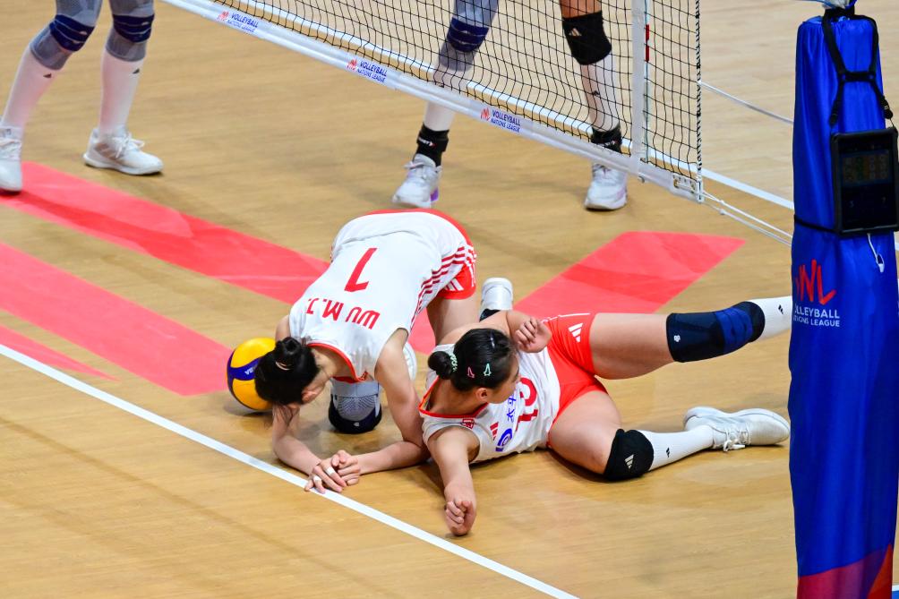 中國隊(duì)球員吳夢(mèng)潔(下左)和王奧芊(下右)在比賽中救球。 新華社記者 朱煒 攝