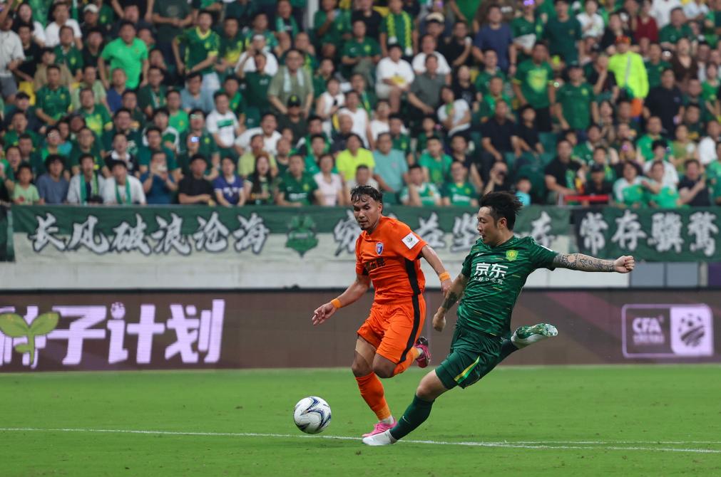 第38分鐘,老將王剛在右路突入禁區(qū)后勁射破門(mén),幫助北京國(guó)安取得兩球領(lǐng)先。上半場(chǎng)補(bǔ)時(shí)階段,北京國(guó)安乘勝追擊,外援古加在禁區(qū)內(nèi)推射,再入一球。