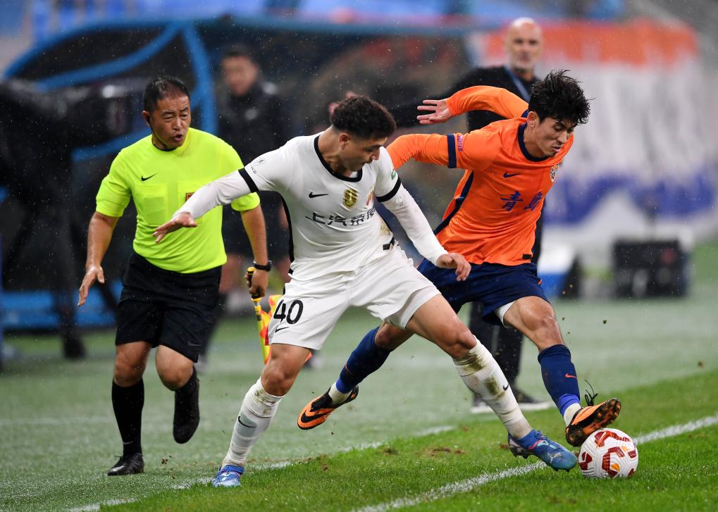 10月17日,上海海港隊球員吾米提江·玉蘇普(前左)在比賽中與青島海牛隊球員買烏郎·米吉提拼搶。當(dāng)日,在山東青島舉行的2025賽季中超聯(lián)賽第27輪比賽中,上海海港隊客場4:3戰(zhàn)勝青島海牛隊。新華社記者 李紫恒 攝