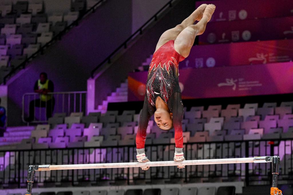 10月21日,中國(guó)選手張清穎在高低杠項(xiàng)目比賽中。新華社發(fā)(阿貢·昆卡亞攝)