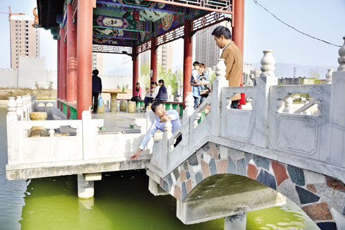 這個時候,宋利峰和女友劉丹,帶著姐姐的孩子也恰好走進水榭。孩子們在興趣方面往往會有驚人的趨同感,宋利峰的小外甥“眼饞”月月手里的魚食,在韓建萍的開導下月月從袋子里抓了一把魚食給了這個陌生的小伙伴。月月仍在水榭西側的欄桿處向水面撒食,宋利峰的小外甥在石拱橋上模仿月月的動作,兩個孩子之間的斜線距離不足一米。