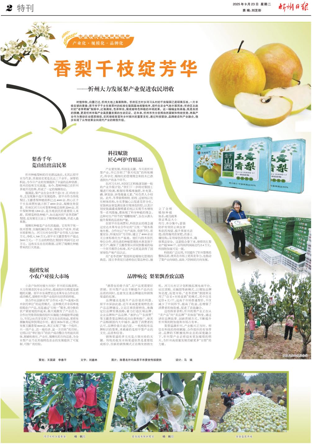 時(shí)值仲秋,白露已過(guò),忻州大地上梨香陣陣。忻府區(qū)蘭村鄉(xiāng)河習(xí)頭村的千畝梨園已是碩果壓枝,一片豐收在望的景象;原平市子干鄉(xiāng)東南賈村的標(biāo)準(zhǔn)化梨園基地規(guī)整有序,現(xiàn)代化農(nóng)業(yè)氣息撲面而來(lái);忻府區(qū)北趙村的“老李君睞”梨園中,紅梨滿枝,色澤鮮亮,展現(xiàn)著特色種植的豐碩成果。這一幅幅金秋畫卷,既是自然的饋贈(zèng),更是忻州市梨產(chǎn)業(yè)高質(zhì)量發(fā)展的生動(dòng)見證。近年來(lái),忻州市充分發(fā)揮自然稟賦和傳統(tǒng)優(yōu)勢(shì),將梨產(chǎn)業(yè)作為推動(dòng)農(nóng)業(yè)提質(zhì)增效、農(nóng)民增收致富和鄉(xiāng)村振興的重要支柱,通過(guò)科技驅(qū)動(dòng)、品牌建設(shè)和產(chǎn)業(yè)融合,穩(wěn)步實(shí)現(xiàn)了從傳統(tǒng)果業(yè)向現(xiàn)代產(chǎn)業(yè)的轉(zhuǎn)型升級(jí)。