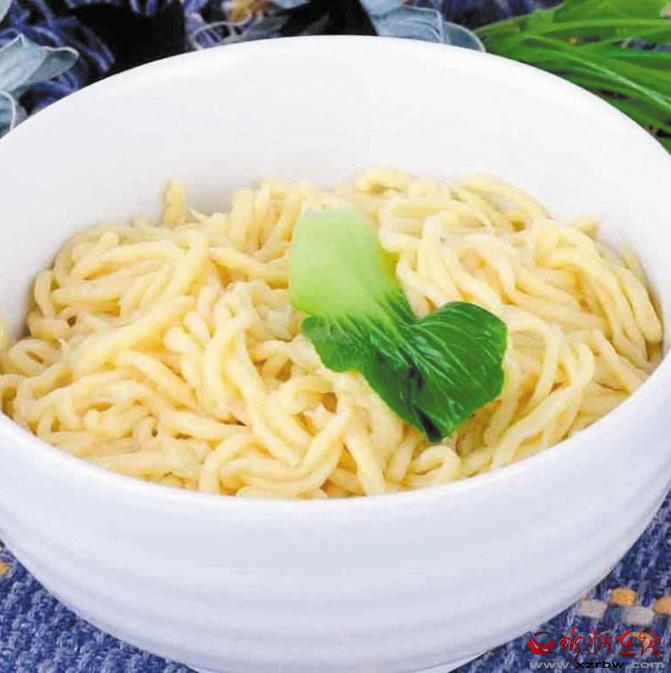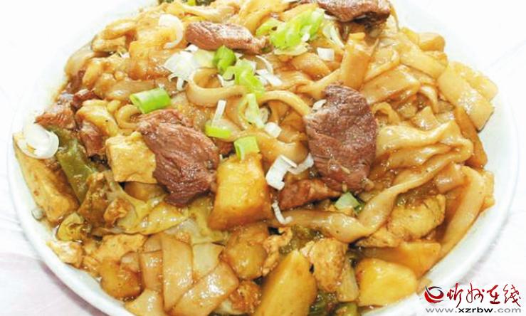 豆面稍加白面制成的豆面河撈是五寨當(dāng)?shù)氐奶厣s糧主食,經(jīng)特制的河撈床下到鍋里,待面壓到一定長度,截斷面條,煮熟后配上各種澆頭,吃著筋滑利口。(張志遠)