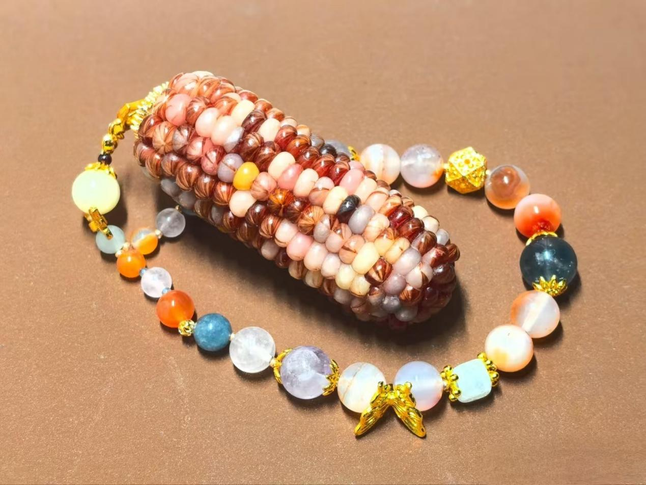 經(jīng)自然晾曬、人工精選、手工創(chuàng)意后,高顏值的玉米迎來(lái)了“七十二變”:配上木質(zhì)底座成為文玩擺件,單粒打孔輔以云南銀飾變成手鏈、鑰匙扣,掛飾、裝飾畫(huà)等。