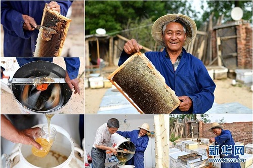 王巨才,男,1949年出生,山西省長治市武鄉(xiāng)縣鳳臺坪村人,2014年被列入建檔立卡貧困戶。2016年,在當?shù)卣膸椭?,王巨才和兒子一起學(xué)習養(yǎng)蜂技術(shù),發(fā)展養(yǎng)蜂產(chǎn)業(yè)。2018年,王巨才銷售蜂蜜收入達到4萬多元。 右上:王巨才肖像;左上:王巨才在去除蜂板上的蜂蠟;左中:王巨才使用搖蜜機取蜜;左下:王巨才將蜂蜜裝到瓶子里;下中:王巨才(右)和兒子將搖蜜機里的蜜倒出;下右:王巨才在整理蜂箱(拼版照片,6月11日攝)。 地處晉東南的山西省長治市,位于由太行山、太岳山環(huán)繞而成的上黨盆地中。在群山中、崖壁上,許多村莊自然條件惡劣,基礎(chǔ)設(shè)施落后,脫貧致富是大山深處人們的迫切心愿。 近年來,一場場脫貧攻堅戰(zhàn),在一個個深山村打響。政府全力探索脫貧路徑的同時,山區(qū)百姓因地制宜,靠自己的雙手和智慧走上致富路,交出了一份扎實的脫貧答卷。 記者在太行山、太岳山一路尋訪,記錄下多位70歲老人的生活。這些共和國的同齡人,親歷了山鄉(xiāng)的巨變,見證著長治山區(qū)脫貧攻堅偉大工程的一步步推進。 新華社記者 詹彥 攝