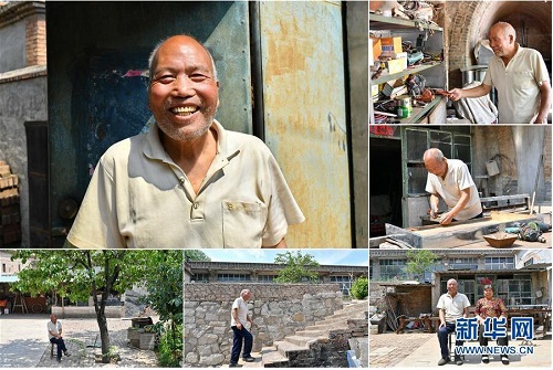 韓忠岐,男,1949年出生,山西省長治市潞城區(qū)垂陽村人,1976年起擔(dān)任村干部。從小熱愛學(xué)習(xí)的韓忠岐對(duì)鄉(xiāng)村發(fā)展有自己獨(dú)特的想法,他鼓勵(lì)村民們學(xué)習(xí)技能,在農(nóng)閑時(shí)“組團(tuán)”外出打工,農(nóng)忙時(shí)鄰里互幫互助,曾經(jīng)貧窮的垂陽村在他的帶領(lǐng)下慢慢富裕起來。退休后,閑不下來的韓忠岐自學(xué)打鐵、電焊技能,現(xiàn)在成了鄉(xiāng)里小有名氣的鐵匠,經(jīng)常為貧困戶開展技術(shù)培訓(xùn)。 左上:韓忠岐肖像;右上:韓忠岐在挑選工具;右中:韓忠岐在制作一個(gè)鐵皮抽屜;右下:韓忠岐和老伴坐在院子里;下中:韓忠岐去鄰居家串門;下左:韓忠岐在院子里乘涼(拼版照片,6月18日攝)。 地處晉東南的山西省長治市,位于由太行山、太岳山環(huán)繞而成的上黨盆地中。在群山中、崖壁上,許多村莊自然條件惡劣,基礎(chǔ)設(shè)施落后,脫貧致富是大山深處人們的迫切心愿。 近年來,一場場脫貧攻堅(jiān)戰(zhàn),在一個(gè)個(gè)深山村打響。政府全力探索脫貧路徑的同時(shí),山區(qū)百姓因地制宜,靠自己的雙手和智慧走上致富路,交出了一份扎實(shí)的脫貧答卷。 記者在太行山、太岳山一路尋訪,記錄下多位70歲老人的生活。這些共和國的同齡人,親歷了山鄉(xiāng)的巨變,見證著長治山區(qū)脫貧攻堅(jiān)偉大工程的一步步推進(jìn)。 新華社記者 曹陽 攝