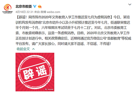 真相:北京市委教育工委、市教委明確表示,這是一條虛假消息。目前,2020年北京義務(wù)教育入學(xué)工作正在按計(jì)劃進(jìn)行中。相關(guān)政策確定后,近期將通過(guò)官方微信公號(hào)“首都教育”等權(quán)威平臺(tái)發(fā)布。