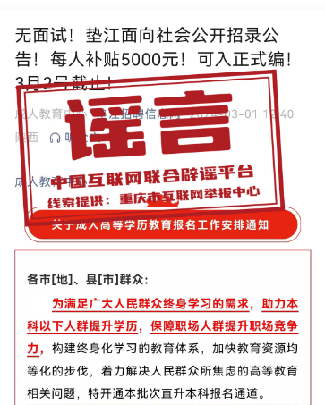 真相:近日,“墊江招聘信息網(wǎng)”微信公眾號發(fā)布信息:“無面試!重慶墊江面向社會公開招錄公告!每人補貼5000元!可入正式編!”部分網(wǎng)民看到該信息后誤認為,墊江面向社會以補貼形式招錄具有正式編制的公務(wù)人員,于是紛紛向墊江縣有關(guān)部門致電咨詢招錄情況。經(jīng)核實,近年來,墊江未曾以補貼方式和不經(jīng)過面試招錄具有正式編制公務(wù)人員。該信息實則為成人學(xué)歷提升培訓(xùn)信息,而非正式編制公務(wù)人員招錄信息。墊江縣互聯(lián)網(wǎng)信息辦公室已依法對發(fā)布該信息的微信公眾號負責(zé)人進行約談和教育批評,指出虛假信息的危害性,并責(zé)令刪除相關(guān)信息。(來源:重慶辟謠)