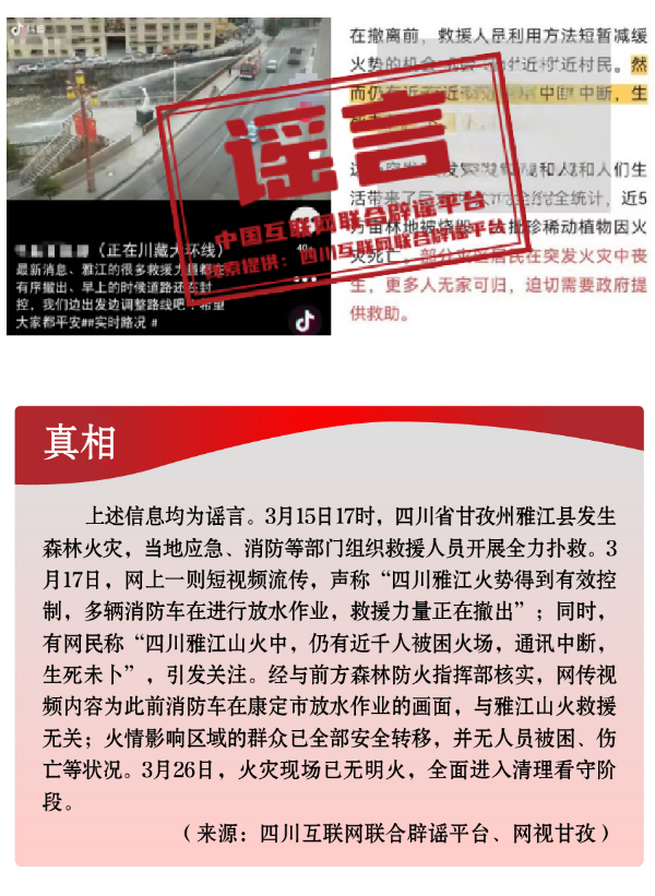 為博流量炮制安全類謠言,引發(fā)恐慌。春季歷來(lái)是森林火災(zāi)高發(fā)時(shí)段。加之開(kāi)春后,工廠企業(yè)復(fù)產(chǎn)復(fù)工,致災(zāi)因素明顯增多。3月,全國(guó)多地發(fā)生火災(zāi)事故,一些網(wǎng)民為蹭熱點(diǎn)、博流量,趁機(jī)編織謠言,引發(fā)公眾恐慌。3月中旬,四川省甘孜州雅江縣發(fā)生森林火災(zāi),在當(dāng)?shù)貞?yīng)急、消防等部門組織救援人員全力撲救之際,卻有人編造“四川雅江山火救援力量正在撤出”“雅江仍有近千人被困火場(chǎng)”“雅江山火有三名撲火人員犧牲”等失實(shí)信息,嚴(yán)重干擾災(zāi)害應(yīng)急響應(yīng)和救援工作?!爸貞c南坪商業(yè)大樓火災(zāi)傷亡慘重”“湖南省長(zhǎng)沙市天心區(qū)發(fā)生重大刑案,警方發(fā)布懸賞通告”“天津一銀行發(fā)生搶劫”等嚴(yán)重失實(shí)的涉公共安全類視頻流傳網(wǎng)絡(luò),或是造謠者自編自導(dǎo),或是利用AI技術(shù)偽造,卻引發(fā)群眾恐慌、造成惡劣影響。此外,“綠得發(fā)黑的菠菜不能吃”“清明蔗、毒過(guò)蛇”等食品安全類謠言,則是利用了時(shí)令和人們對(duì)食物中毒的擔(dān)憂情緒,夸大其詞、危言聳聽(tīng),目的都是販賣焦慮、制造恐慌,進(jìn)而吸引眼球、騙取流量。