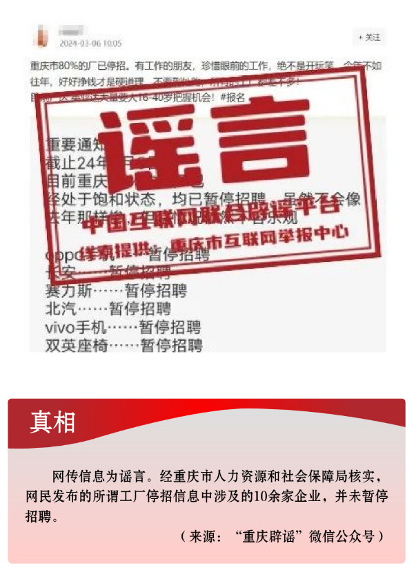 搭蹭熱點(diǎn)散播民生類謠言,渲染焦慮。3月,全國(guó)兩會(huì)召開(kāi),“民生清單”熱度高?!按赫小薄按河巍钡葧r(shí)間節(jié)點(diǎn),有關(guān)招工就業(yè)、疫病傳染等內(nèi)容也成為個(gè)別網(wǎng)民博眼球的素材。一些個(gè)人或自媒體歪曲甚或虛構(gòu)事實(shí),編造散布社會(huì)民生謠言,引發(fā)公眾不必要的焦慮。如,別有用心者惡意虛構(gòu)事實(shí),發(fā)布“重慶80%的工廠暫停招聘”“湖南郴州疫情卷土重來(lái)”等虛假信息,渲染負(fù)面情緒、徒增公眾憂慮、擾亂社會(huì)秩序;還有人為吸引流量、博取關(guān)注,根據(jù)主觀臆想,采取移花接木等手段,散播“京滬高速公路停止收費(fèi)”“浙江麗水機(jī)場(chǎng)已建成投用并首航”“重慶合川太和飛機(jī)場(chǎng)正式開(kāi)建”等涉重大基礎(chǔ)設(shè)施建設(shè)項(xiàng)目的假消息,誤導(dǎo)公眾認(rèn)知,擾亂群眾交通出行秩序。