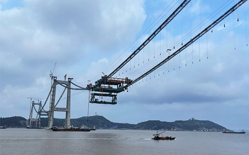 “大橋主梁最大節(jié)段重量達(dá)到813噸,國內(nèi)現(xiàn)有纜載吊機(jī)根本無法滿足單臺(tái)起吊需求?!迸藵?jì)向記者表示,為解決這一難題,項(xiàng)目創(chuàng)新研制國內(nèi)首套1000噸級(jí)纜載吊機(jī),搭載人機(jī)界面、傳感器技術(shù)、通訊技術(shù)等技術(shù),把安裝精度誤差控制在5毫米內(nèi),確保施工過程安全高效。