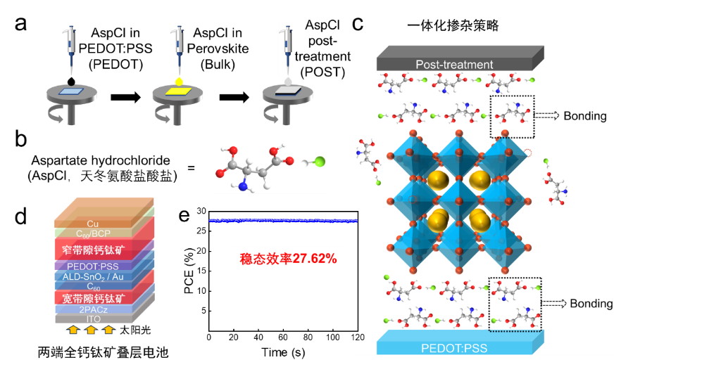 為此,研究團隊將天冬氨酸鹽酸鹽引入到全鈣鈦礦疊層太陽能電池底部的空穴傳輸層、鈣鈦礦體吸光層和上界面層中,開發(fā)了一種采用同一分子處理的一體化摻雜策略,極大地改善了鈣鈦礦薄膜的質(zhì)量。除了與鈣鈦礦前驅(qū)體配位外,天冬氨酸鹽酸鹽分子還具有很強的分子間氫鍵,富集在鈣鈦礦上、下界面處的天冬氨酸鹽酸鹽因此充當了鈣鈦礦層和傳輸層界面之間的分子鎖,進一步提升了鈣鈦礦材料的性能和穩(wěn)定性。