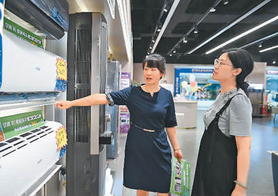 7月11日,在重慶市沙坪壩區(qū)的一家家電門店,工作人員在向消費(fèi)者介紹智能家電以舊換新活動(dòng)。孫凱芳攝(人民視覺)