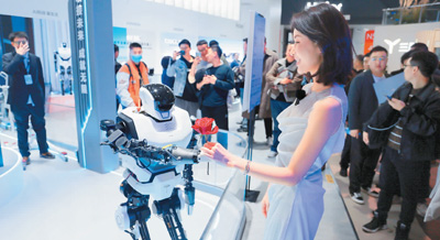 3月14日,在上海市舉辦的中國家電及消費(fèi)電子博覽會(huì)上,海爾公司的AI人形家庭機(jī)器人現(xiàn)場(chǎng)向人們贈(zèng)送玫瑰。陳玉宇攝(人民視覺)
