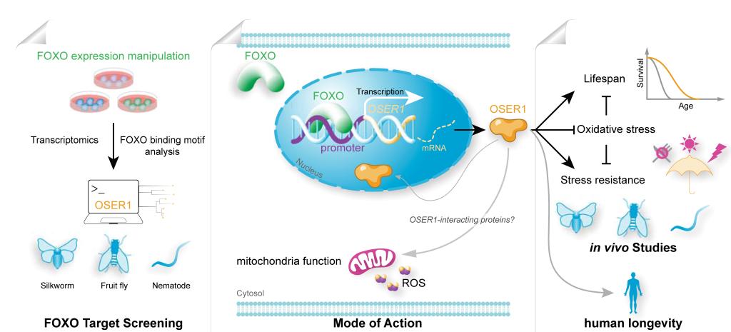 為了闡釋OSER1調(diào)節(jié)長壽的作用機制,研究團隊在家蠶、線蟲和果蠅中進行了一系列的分子生物學實驗。研究結(jié)果共同表明,OSER1是叉頭框蛋白O的直接靶基因,OSER1能夠響應(yīng)過氧化氫誘導的氧化應(yīng)激,并通過提升機體氧化應(yīng)激防御力發(fā)揮延長壽命的作用。