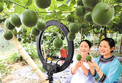 互聯(lián)網(wǎng)平臺互聯(lián)互通,將為電子商務(wù)從業(yè)者和消費者帶來更多便利。圖為日前,在貴州省黔東南苗族侗族自治州榕江縣仁里水族鄉(xiāng)通倒村羅漢果種植基地,工作人員在直播推介當?shù)爻霎a(chǎn)的羅漢果。李長華攝(人民視覺)