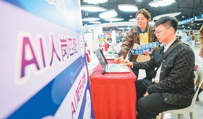 日前,在福建省福州市鼓樓區(qū)安泰街道南門兜地鐵站里舉行的2025年就業(yè)援助月專項活動中,工作人員利用AI技術(shù)和大數(shù)據(jù)分析等先進(jìn)技術(shù),為求職者提供智能化的崗位匹配和職業(yè)規(guī)劃建議。謝貴明攝(人民視覺)