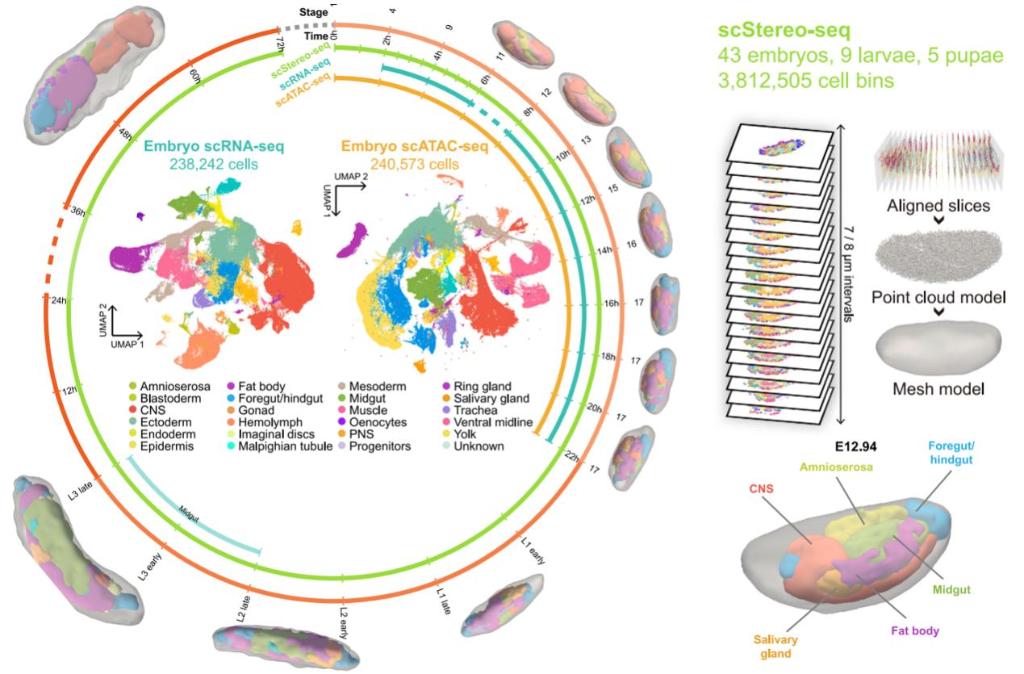 杭州華大生命科學(xué)研究院與南方科技大學(xué)創(chuàng)建了一個(gè)解碼動(dòng)物發(fā)育過(guò)程的多模態(tài)數(shù)據(jù)集,生成了果蠅全發(fā)育周期的3D單細(xì)胞時(shí)空多組學(xué)圖譜,為生物發(fā)育提供了分子層面的參考,有望為發(fā)育缺陷及相關(guān)疾病機(jī)制研究奠定基礎(chǔ)。相關(guān)成果26日發(fā)表于國(guó)際學(xué)術(shù)期刊《細(xì)胞》。