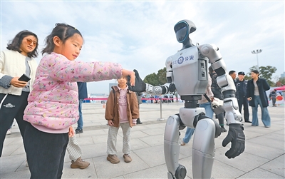 10月25日,江蘇省揚(yáng)州市公安局在揚(yáng)州市明月湖廣場(chǎng)舉行警營(yíng)開放日活動(dòng),現(xiàn)場(chǎng)設(shè)立多個(gè)主題互動(dòng)展區(qū),市民可以近距離接觸警務(wù)裝備。圖為人形機(jī)器人與小朋友互動(dòng)。孟德龍攝(人民視覺)