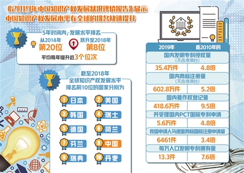 9月14日,中國國家知識產(chǎn)權(quán)局知識產(chǎn)權(quán)發(fā)展研究中心發(fā)布的《2019年中國知識產(chǎn)權(quán)發(fā)展?fàn)顩r評價報告》顯示,中國知識產(chǎn)權(quán)發(fā)展水平在全球的排名快速提升,短短5年時間內(nèi),排名已從2014年的第20位,快速躍升至2018年的第8位,平均每年提升近3個位次。