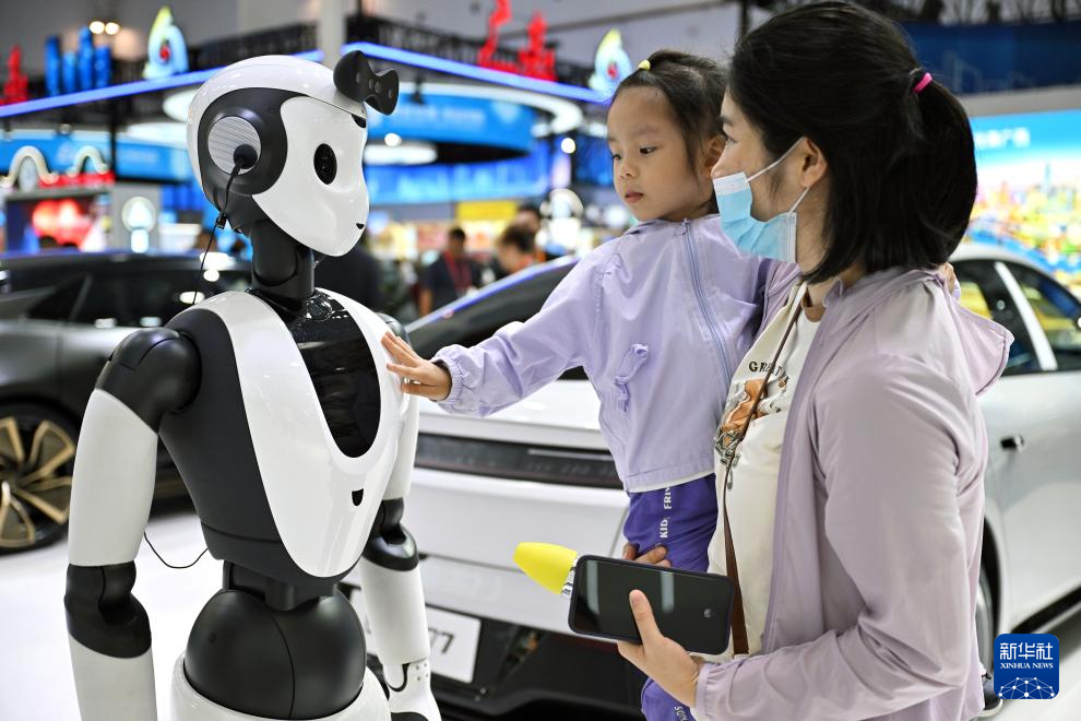 4月15日,觀眾在消博會(huì)上與AI人形智能服務(wù)機(jī)器人互動(dòng)。新華社記者 郭程 攝