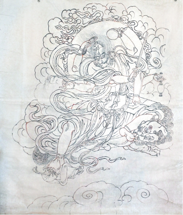 在李向東看來,臨寫是為了學(xué)習(xí)而不是“復(fù)制”壁畫。面對殘破或年久漫漶不清的畫面,他從蛛絲馬跡入手反復(fù)揣摩,根據(jù)壁畫整體的線描、造型特點,一一補(bǔ)而畫之,最后定稿。從這個意義上說,李向東也使殘破的公主寺壁畫得以復(fù)原,“補(bǔ)壁”之功不可小覷。