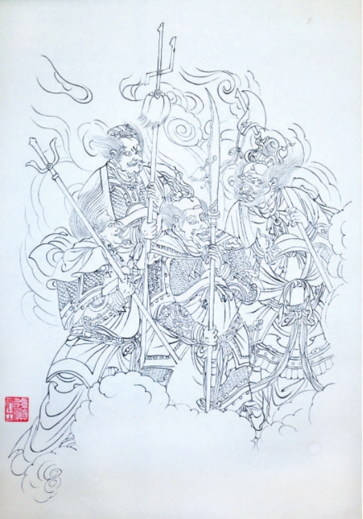 更令李向東醉心不已的是,壁畫中人物衣袖明明是靜態(tài),卻似乎被微風(fēng)吹動、卷起形成鼓動之勢,仿佛下一秒就要隨風(fēng)起舞。在靜止的壁畫中,畫師勾勒出搖動的扇面、飛舞的發(fā)絲,以及在眾仙家之間縹緲虛幻的云海,創(chuàng)造了靈動出畫的動態(tài)美。眾神佛道三五成群,看似錯落隔離,卻又遙相呼應(yīng),彼此相望,顧盼生輝,呼之欲出。在人物群像中,李向東對金剛座神的畫法最為推崇——面目粗獷,體格魁偉,毛發(fā)濃密,一雙銅鈴般的眼睛微微斜視,須眉怒張,威風(fēng)凜凜。身體重心偏向一側(cè),一手持金剛杵于肩頭,一手探掌護(hù)于胸前,全身肌肉緊繃,顯示出畫師對線條的熟練運(yùn)用和高超的造型能力。
